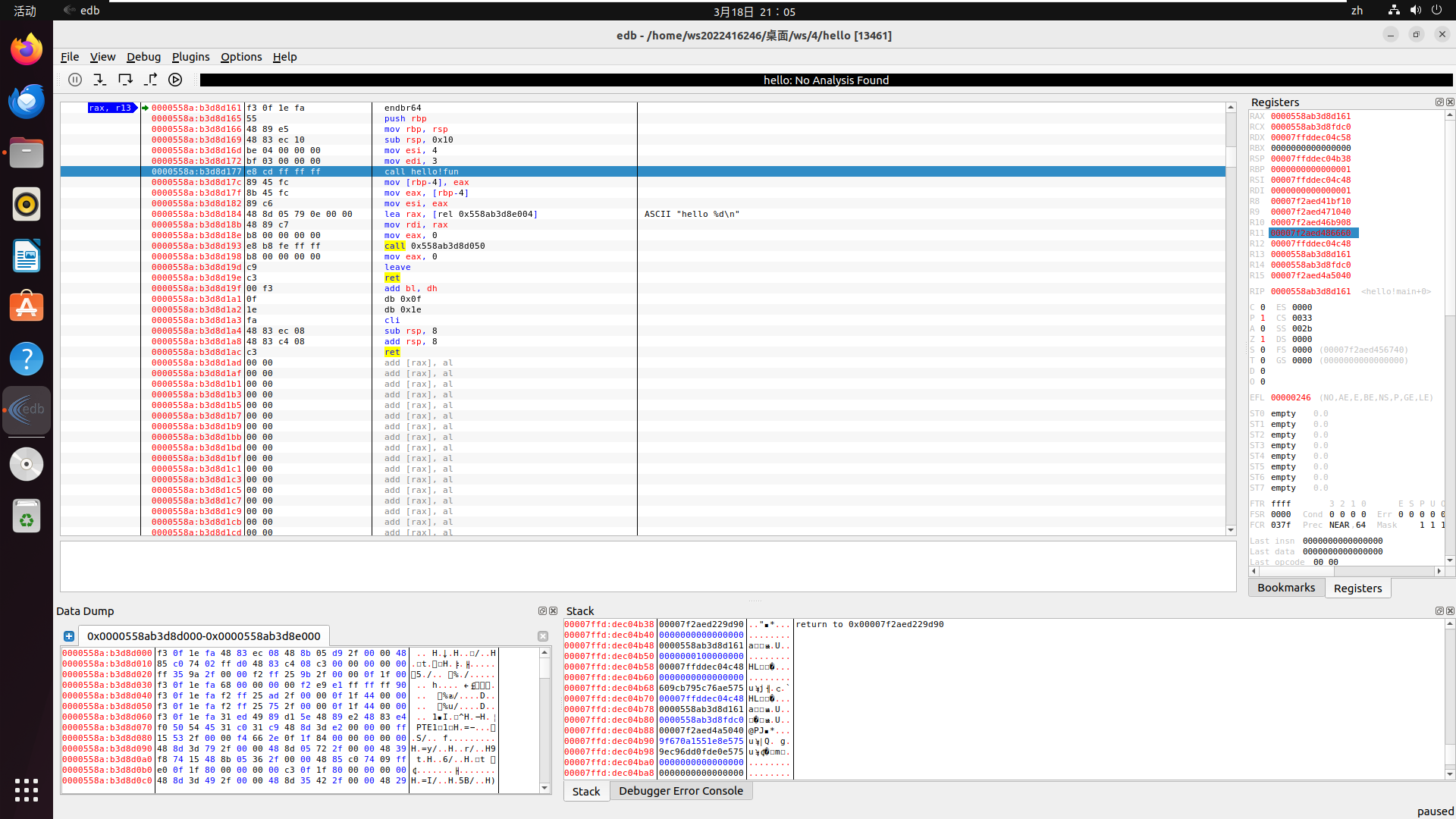 endbr64: 可能是一个保留指令,用于指示 64 位代码段的开头。push rbp: 将当前栈底指针rbp的值压入栈中,准备建立栈帧。mov rbp, rsp: 设置栈底指针rbp的值为当前栈顶指针rsp的值,建立栈帧。sub rsp, 0x10: 分配 16 字节的空间给局部变量。mov esi, 4: 将立即数 4 移入寄存器 esi 中。mov edi, 3: 将立即数 3 移入寄存器 edi 中。call hello_fun: 调用名为 hello_fun 的函数。mov [rbp-4], eax: 将函数返回值保存到栈帧中的位置。mov eax, [rbp-4]: 将之前保存在栈帧中的函数返回值移入 eax 寄存器。mov esi, eax: 将 eax 寄存器中的值移入 esi 寄存器。lea rax, [rel 0x6361e9cc0004]: 将相对地址 0x6361e9cc0004 加载到 rax 寄存器中。mov rdi, rax: 将 rax 中的值移入 rdi 寄存器。mov eax, 0: 将 0 移入 eax 寄存器。call 0x6361e9cbf050: 调用地址 0x6361e9cbf050 处的函数。mov eax, 0: 将 0 移入 eax 寄存器。leave: 恢复栈帧。ret: 返回。